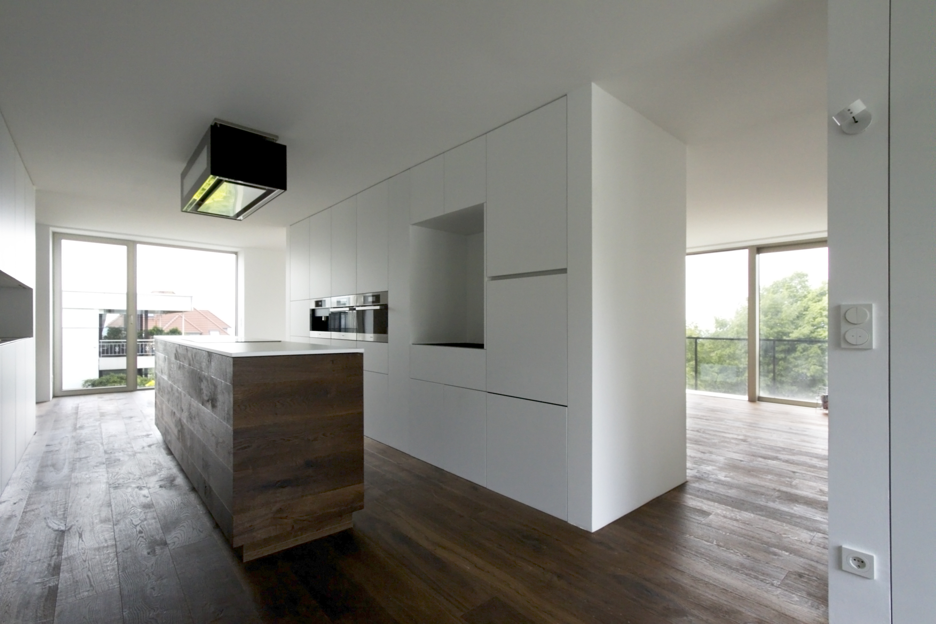 Rustikale Dielenböden aus Eiche, mit denen auch die freistehenden Küchenblöcke belegt wurden, weiße Einbaumöbel und gespachtelte Oberflächen inden Nassbereichen prägen die neuen Räume.