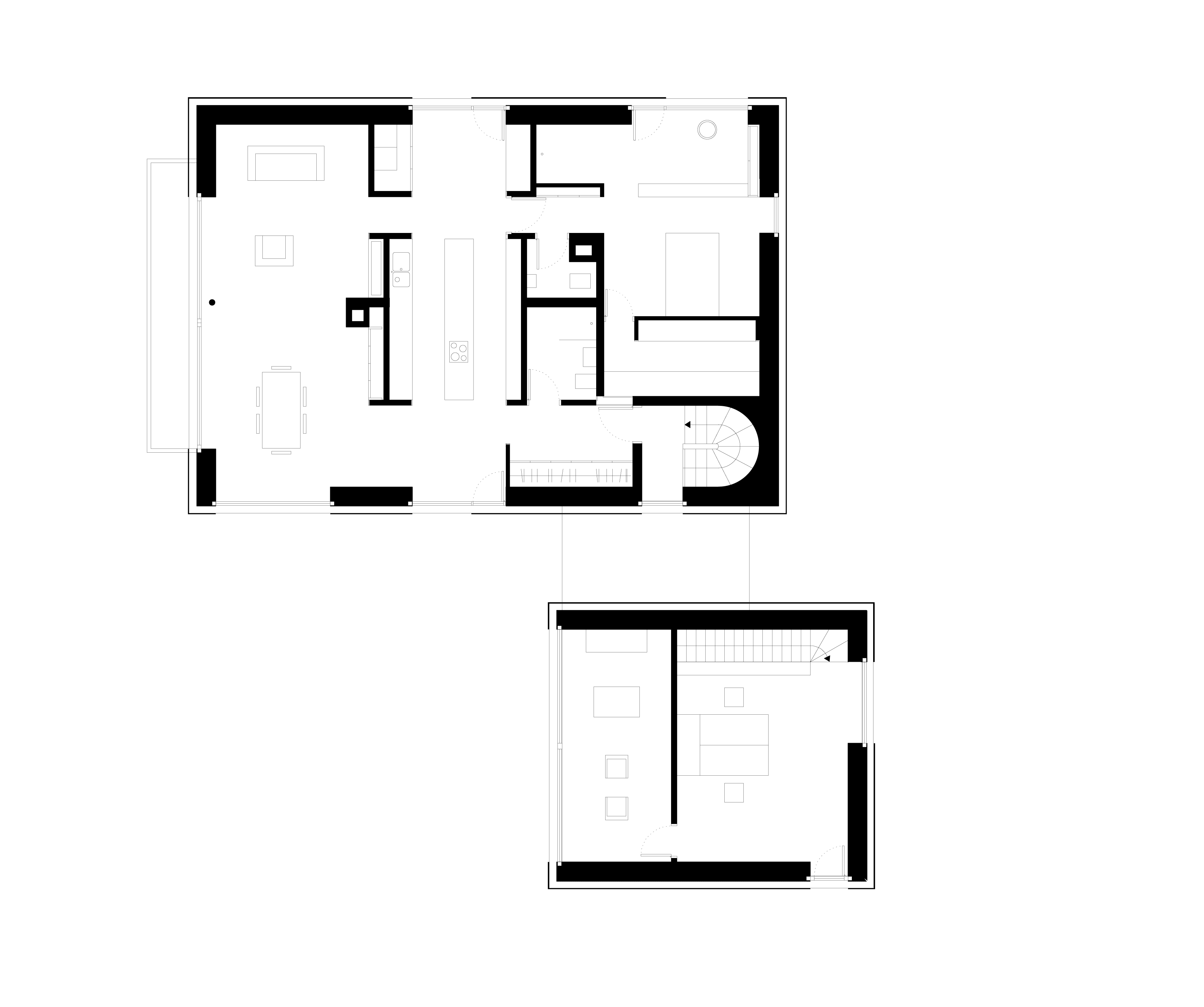 Das ursprünglich als Einfamilienhaus mit separater Einliegerwohnung konzipierte Wohnhaus aus den 70er Jahren wurde weitgehend entkernt und partiell aufgestockt.