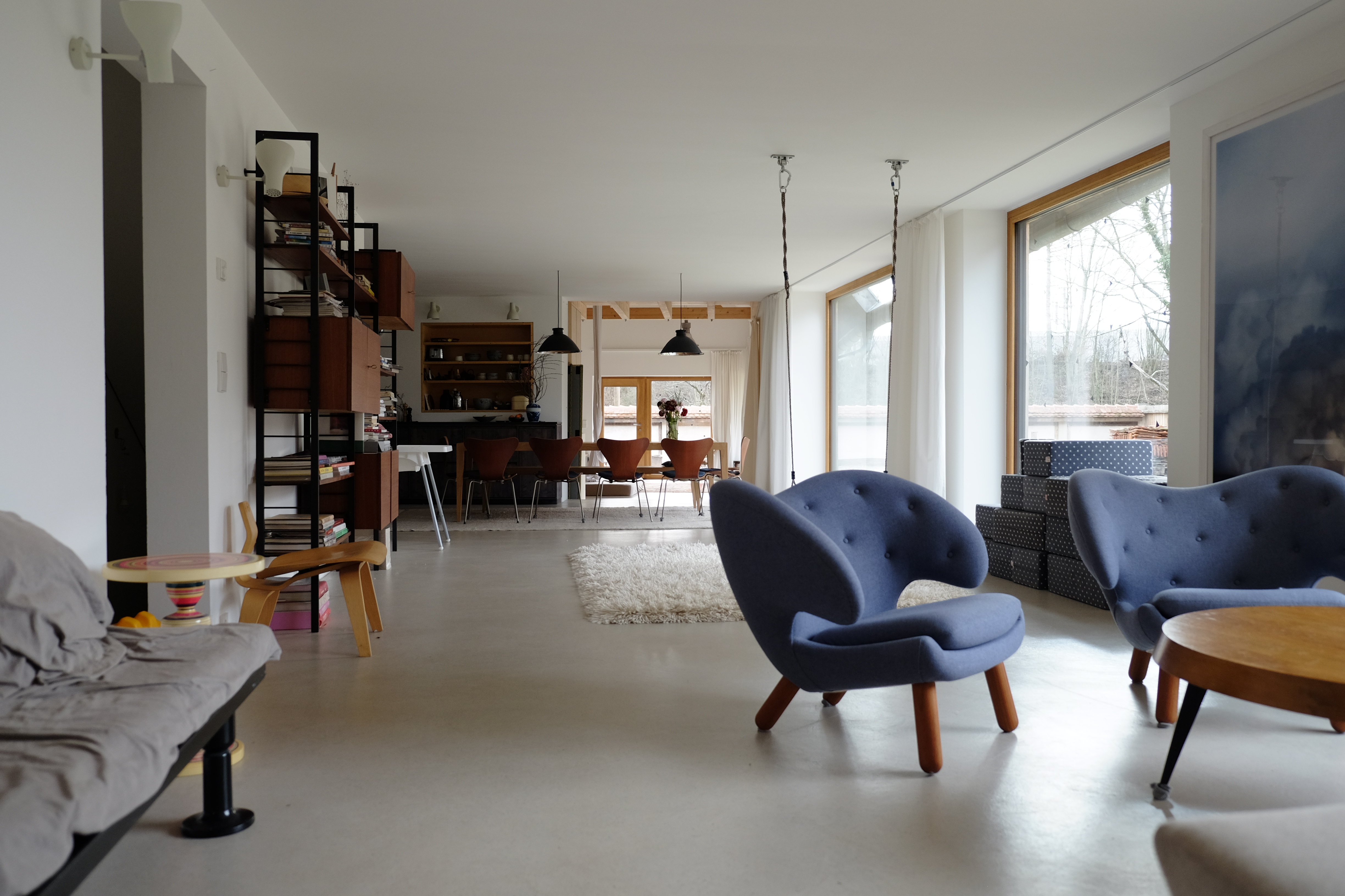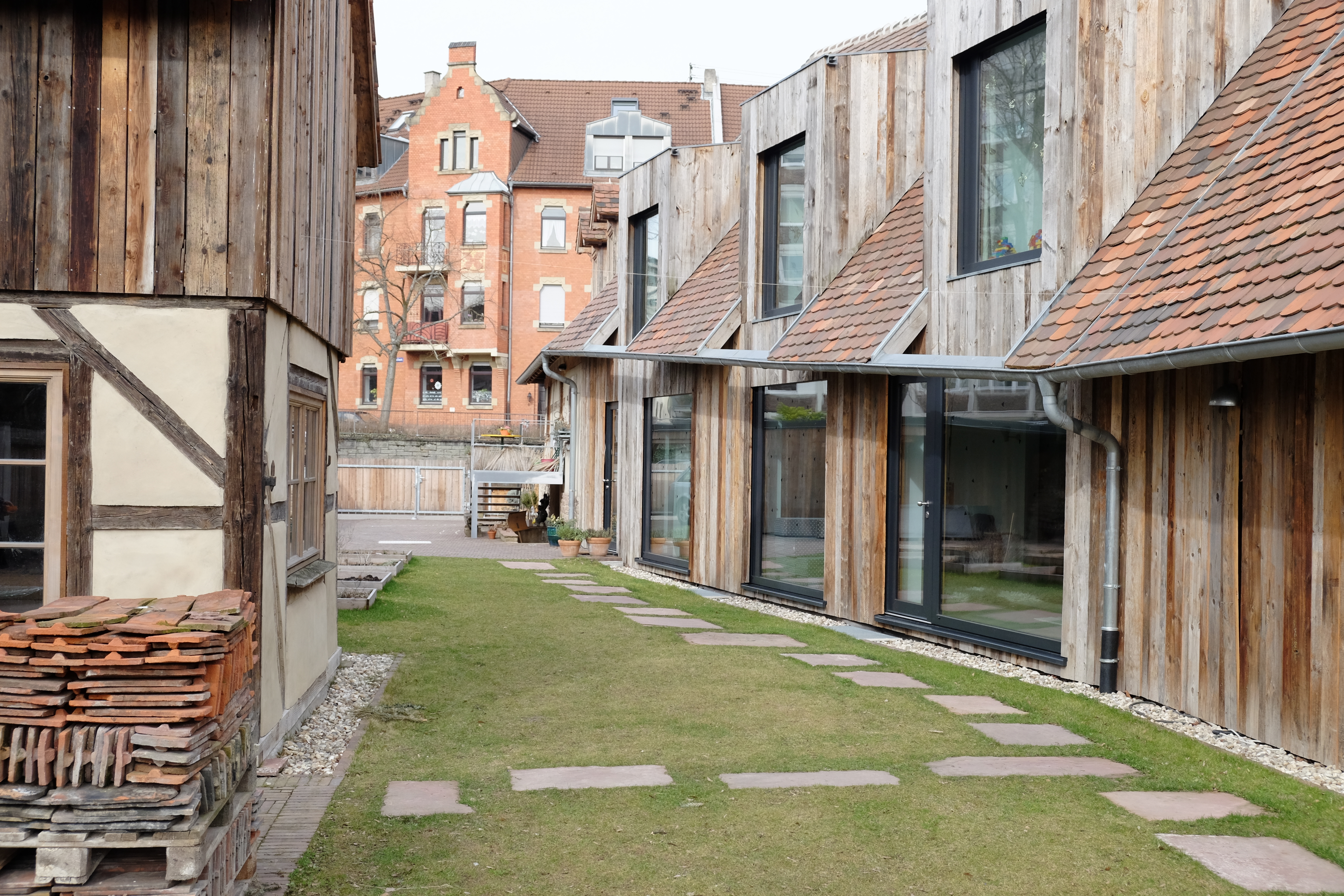 Entstanden durch das scheinbar einfache Verbinden unterschiedlicher Firsthöhen und Gebäudebreiten von Vorderhaus und zwei zu erhaltenden Garagen in der Tiefe des Grundstücks. Drei große, zunächst überdimensioniert wirkende Dachgauben, bündig aus der Fassadenebene entwickelt, recken sich neugierig in die Höhe und gliedern die Längsseite. Ebenso auffallend großflächige Verglasungen führen zu einer spannungsvollen, höchst individuellen Fassadengestaltung und zu einer modernen, unerwartet großzügigen Raumvielfalt im Innern. Mitverantwortlich für dieses Empfinden sind auch die oft schon von einem gewissen Alter gezeichneten natürlichen Materialien sowie einer auf das Minimum reduzierten, sehr feinen Detaillierung. (Auszug Juryprotokoll Hugo-Häring-Auszeichnung 2017)