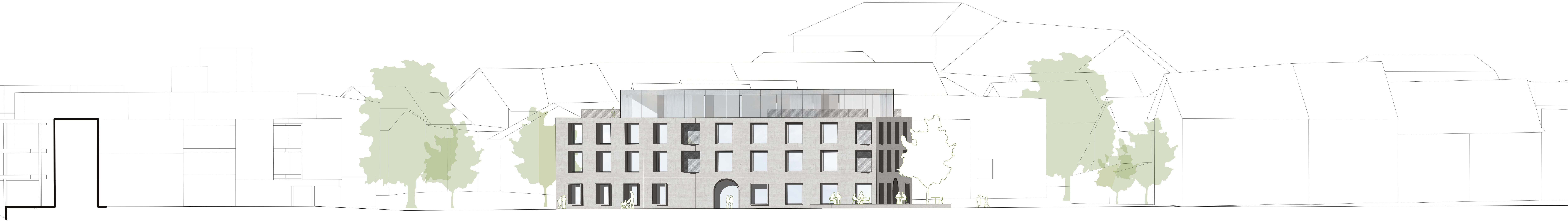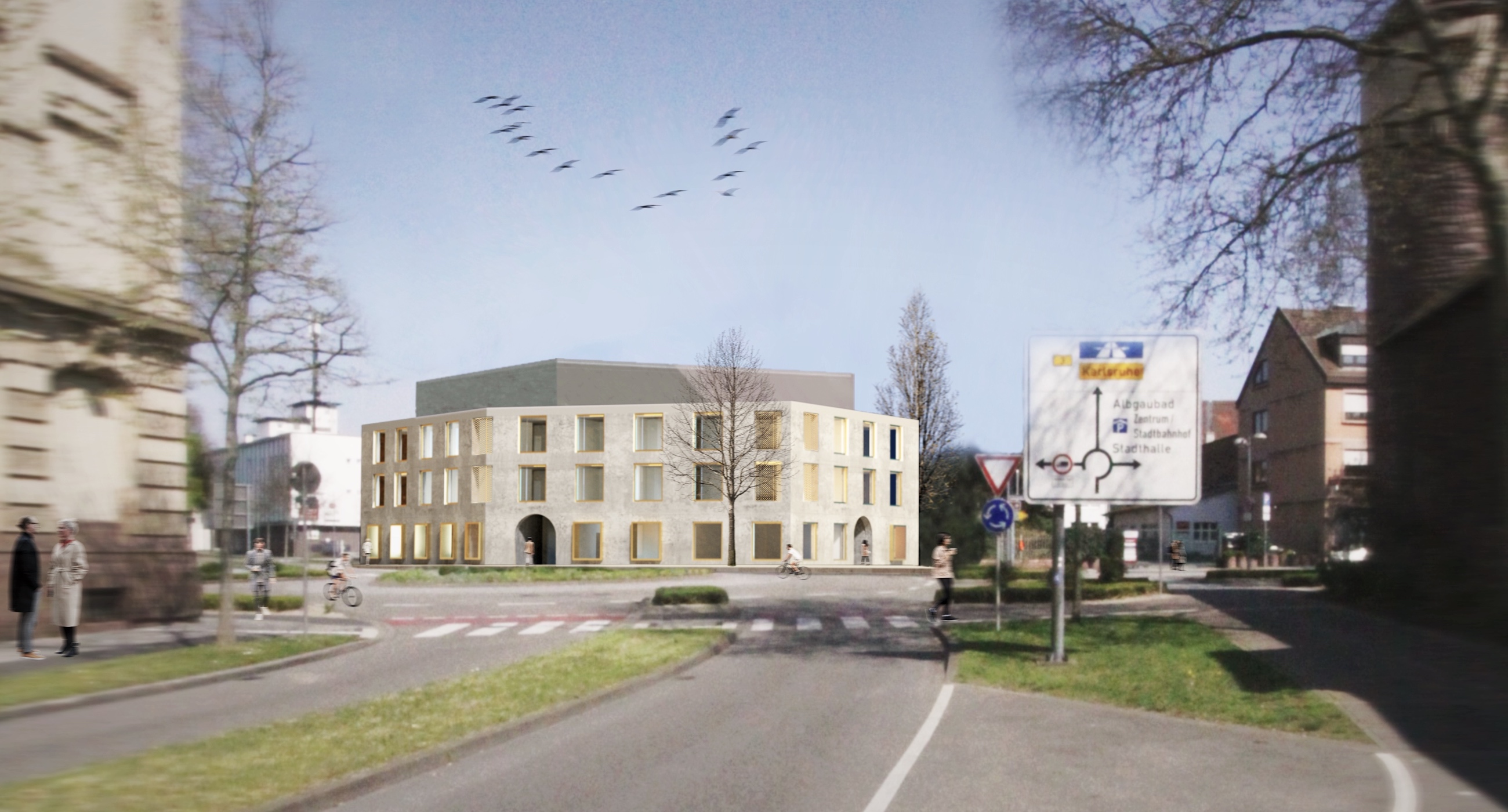 Der Entwurf reagiert in besonderer Weise auf diese Situation, indem er sich als Solitär versteht und durch die bewusst gewählten Gestaltungsmittel behutsam auf dieses heterogene Situation reagiert.